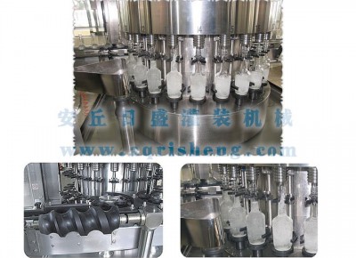 瓶子與灌裝閥上下方向不運動,故障率極低:彈性定位夾同時卡住瓶身,瓶脖,使閥口瓶口準確對中定位:高速液柱快速準量灌裝、工作穩定可靠。
