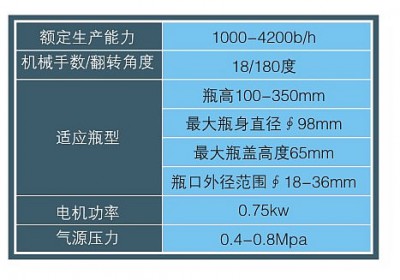 本產(chǎn)品自動(dòng)化程度高,節(jié)省人工:機(jī)械手工作穩(wěn)定可靠,產(chǎn)品檢驗(yàn)簡(jiǎn)單明了:翻轉(zhuǎn)導(dǎo)軌與機(jī)械手同步協(xié)調(diào),增大了瓶高適應(yīng)范圍。